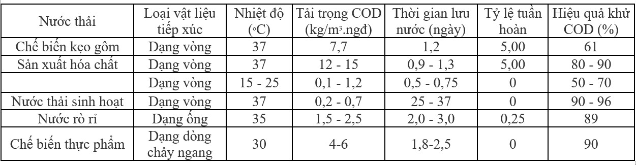 Nồng độ COD đầu vào nhỏ nhất là 100 mg/l, SS < 3.000 mg/l và tốc độ dòng nước dâng < 1m/h.